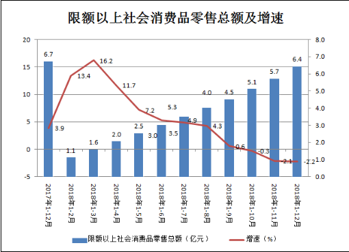从消费形态来看:限额以上餐饮收入降幅收窄,前12月累计完成3917.8万元,同比下降5.4%,较前11月收窄5.4个百分点,占限额以上社会消费品零售总额的6.1%;限额以上商品零售小幅下降,前11月累计完成59976.2万元,同比下降2%,占限额以上社会消费品零售总额的93.9%。