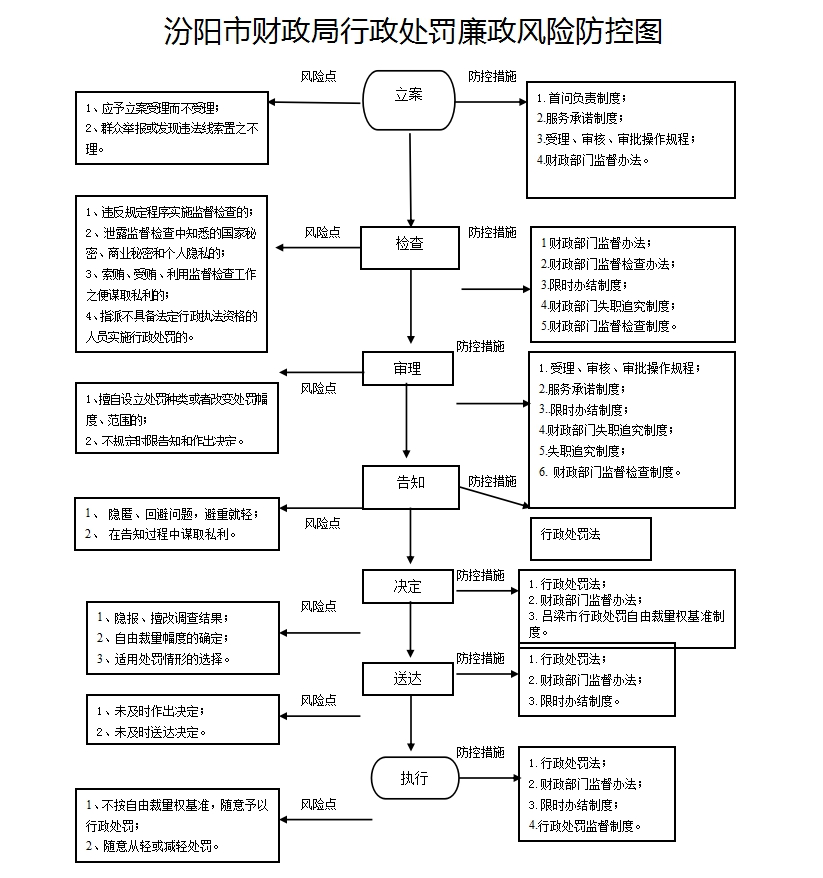 1、立案阶段责任:根据工作职责和计划,以及日常监督发现的线索或者群众举报的案件开展监督检查。 2、调查阶段责任:制发并送达《财政检查通知书》,实施检查。依照《财政监督工作底稿规则》,制作监督检查工作底稿,于检查工作结束后10个工作日内,形成书面监督检查报告。 3、审查阶段责任:对工作底稿、检查报告等材料进行复核。 4、告知阶段责任:财政部门在做出处理决定前,应书面告知当事人违法事实,作出处理决定的事实、理由、依据及其享有的陈述、申辩、要求听证等权利。 5、决定阶段责任:财政部门收到监督检查报告之日起30日内依照法定权限作出处理决定或者检查意见。 6、送达阶段责任:将处理决定或者检查意见,送达监督对象。 7、执行阶段责任:督促监督对象落实处理决定或检查意见,并于送达之日起30日内上报执行情况书面报告。 8、事后监管责任:信息公开、监督结果运用。 9、其他法律法规规章文件规定应履行的责任。 |