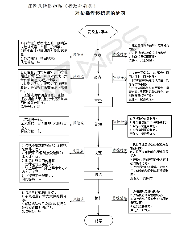 5、决定责任:制作行政处罚决定书,载明行政处罚告知、当事人陈述申辩或者听证情况等内容。6、送达责任:行政处罚决定书按法律规定的方式送达当事人7、执行责任:依照生效的行政处罚决定执行。8、其他法律法规规章文件规定应履行的责任。 |