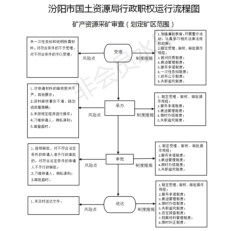 1、受理责任:公示应当提交的材料,一次告知补正材料、依法受理或者不予受理(不予受理应告知理由) 2、审查责任:对申请人提交的申请材料进行审查核实。 3、决定责任:作出行政许可或者不予行政许可决定,法定告知(不予决定应当告知理由。 4、送达责任:准予许可的向出具划定矿区范围批复或者上报吕梁市国土资源局。 5、监管责任:建立实施监督检查的运行机制和管理制度,开展日常监管,依法采取相关处置措施。 6、其他法律法规规章规定应履行的责任 |
