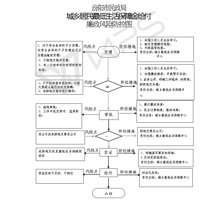 1、受理责任:受理乡镇人民政府(街道办事处)报送的申请材料、家庭经济状况调查结果、民主评议和公示情况等相关材料。 2、审查责任:全面审查乡镇人民政府(街道办事处)上报的调查材料和审核意见(含民主评议结果),并按照不低于30%的比例入户抽查。 3、决定责任:自收到乡镇人民政府(街道办事处)审核意见和相关材料5个工作日提出审批初步意见。拟批准纳入低保范围的,应当同时确定保障金额。不符合条件、不予批准的,应当在作出审批决定3日内,通过乡镇人民政府(街道办事处)书面告知申请人或者其代理人并说明理由。 经公示无异议的,县级人民政府民政部门应当在3个工作日内做出审批决定,批准纳入低保范围,发给低保证。 4、给付责任:批准纳入低保范围的,从批准之日下月起发放低保金。对公示有异议的,县级人民政府民政部门应当重新组织调查核实,在20个工作日内做出审批决定。 5、监管责任:根据乡镇人民政府(街道办事处)上报的复核情况办理低保金停发、减发或者增发手续。 健全完善举报核查制度,对接到的实名举报,应当逐一核查,并及时向举报人反馈核查处理结果。 6、其他法律法规规章文件规定应履行的责任。 |