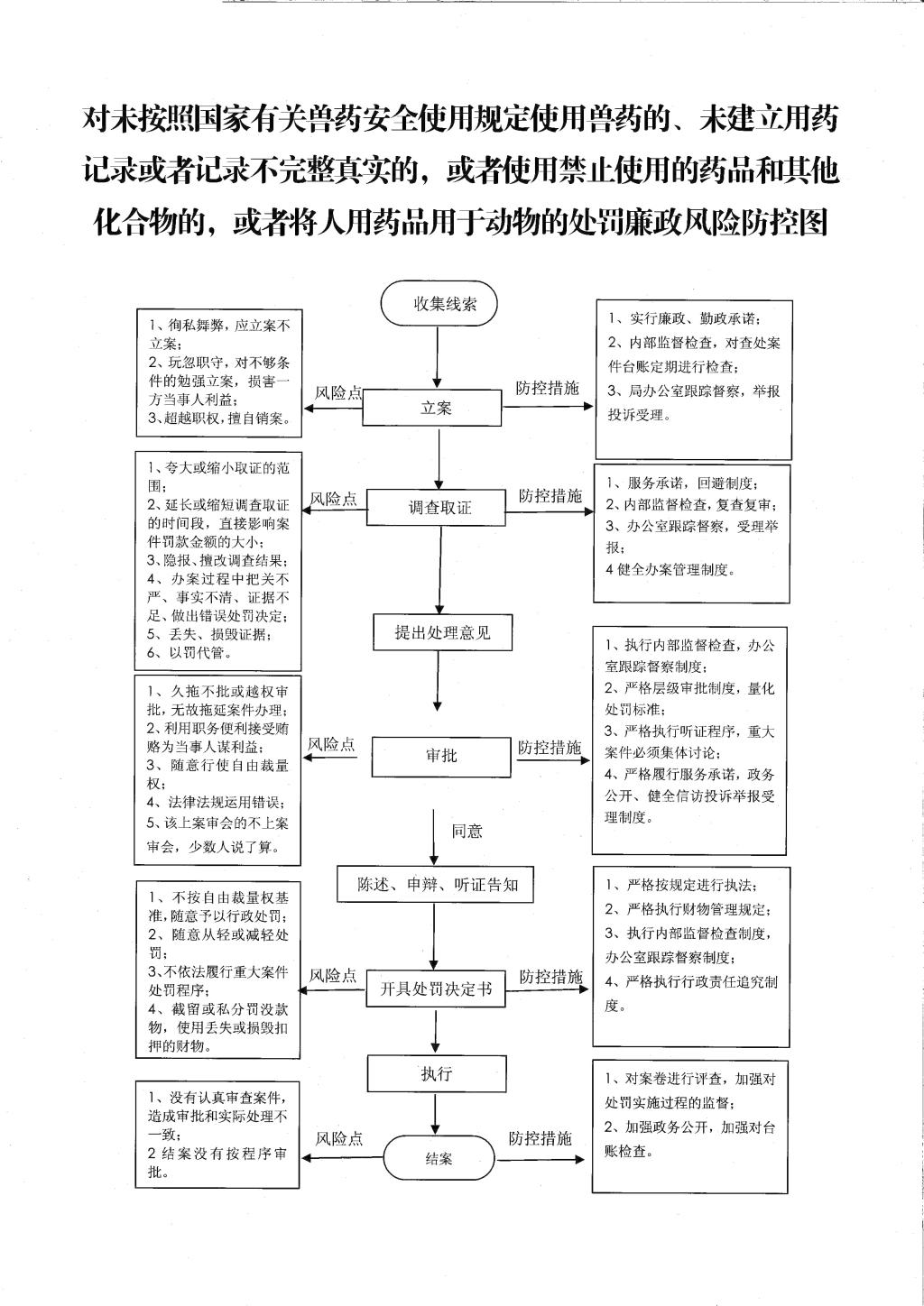 1、立案责任:发现未按照国家有关兽药安全使用规定使用兽药的、未建立用药记录或者记录不完整真实的,或者使用禁止使用的药品和其他化合物的,或者将人用药品用于动物的违法行为,予以审查、决定是否立案。 2、调查责任: 对立案的案件,指定专人负责,及时组织调查取证,与当事人有直接利害关系的应到回避。执法人员不得少于两人,调查时应出示执法证件,允许当事人辩解陈述。执法人员应保守有关秘密。 3、审查责任:审理案件调查报告,对案件违法事实、证据、调查取证程序、法律适用、处罚种类和幅度、当事人陈述和身边理由等方面进行审查,提出处理意见(主要证据不足时,以适当的方式补充调查)。 4、告知责任:作出行政处罚决定前,应制作《行政处罚告知书》送达当事人,告知违法事实及其享有的 陈述、申辩等权利。符合听证规定的,制作并送达《行政处罚听证告知书》。 5、决定责任:制作行政处罚决定书,载明行政处罚告知、当事人陈述申辩或者听证情况等内容。 6、送达责任:行政处罚决定书按法律规定的方式送达当事人 7、执行责任:依照生效的行政处罚决定,进行处罚。 8、其他法律法规规章文件规定应履行的责任。 |