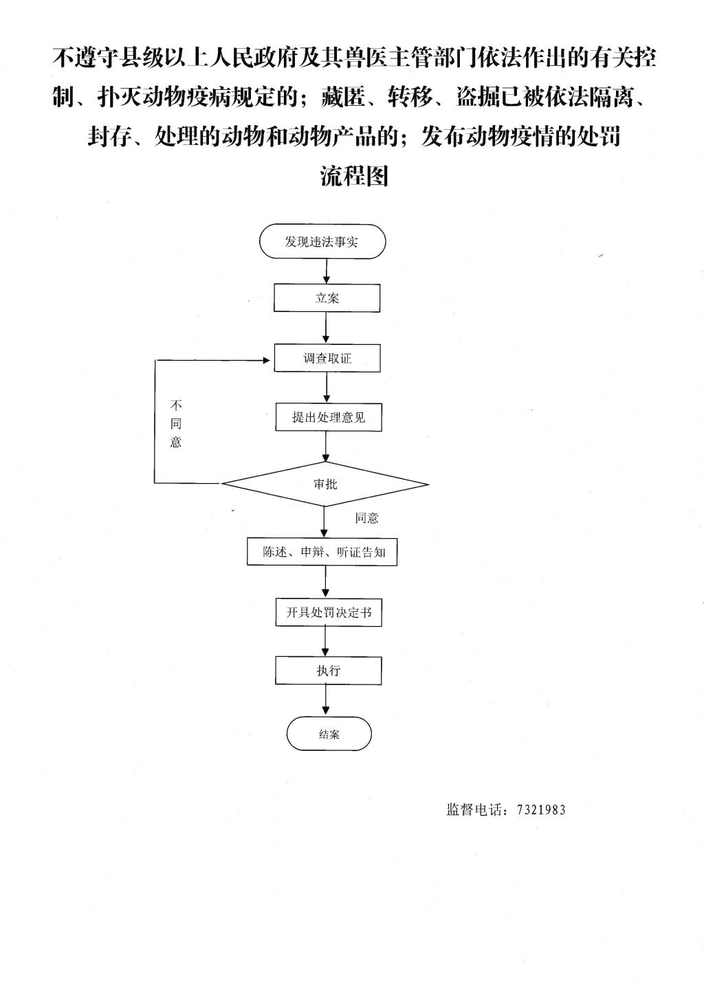 1.立案环节责任:执法人员经初步调查,发现公民、法人或者其他组织涉嫌有违法行为依法应当给予行政处罚的,应当填写《行政处罚立案审批表》,报本行政处罚机关负责人批准立案。 2.调查环节责任:对立案的案件,指定专人负责,与当事人有直接利害关系的应当回避。执法人员调查收集证据时不得少于二人。 3.审查环节责任:农业行政处罚机关应当对案件情况进行全面、客观、公正地调查,收集证据;必要时,依照法律、法规的规定,可以进行检查。 4.告知环节责任:在作出行政处罚决定之前,农业行政处罚机关应当制作《行政处罚事先告知书》,送达当事人,告知拟给予的行政处罚内容及其事实、理由和依据,并告知当事人可以在收到告知书之日起三日内,进行陈述、申辩。符合听证条件的,告知当事人可以要求听证。 5.决定环节责任:农业行政处罚机关应当及时对当事人的陈述、申辩或者听证情况进行审查,认为违法事实清楚,证据确凿,决定给予行政处罚的,应制作盖有作出行政处罚决定的渔业执法部门的公章的行政处罚决定书,载明违法事实和证据、处罚依据和内容、申请行政复议或提起行政诉讼的途径和期限等内容。行政处罚决定中涉及没收物品的,还应当附没收物品凭证。 6.送达环节责任:《行政处罚决定书》应当在宣告后当场交付当事人;当事人不在场的,应当在七日内送达当事人,并由当事人在《送达回证》上签名或者盖章。 7.执行环节责任:依照生效的行政处罚决,主管部门监督当事人履行。当事人逾期不履行的,可依法采取加处罚款、申请法院强制执行等措施。 8.其他法律法规规章规定应履行的责任。 |
