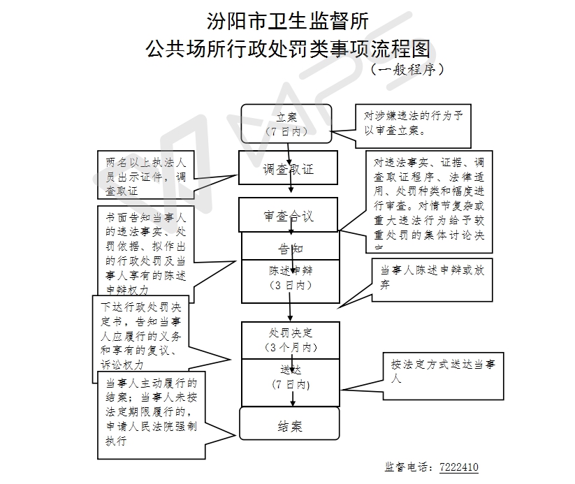 1、立案责任:发现违反公共场所卫生管理相关法律法规规章规范的违法行为或举报案件,予以审查、决定是否立案。 2、调查责任:公共综合执法科室及乡镇卫生监督站对各自辖区内立案的案件,指定专人负责,及时组织调查取证,与当事人有直接利害关系的应到回避。执法人员不得少于两人,调查时应出示执法证件,允许当事人辩解陈述。执法人员应保守有关秘密。 3、审查责任:审理案件调查报告,对案件违法事实、证据、调查取证程序、法律适用、处罚种类和幅度、当事人陈述和身边理由等方面进行审查,提出处理意见(主要证据不足时,以适当的方式补充调查)。 4、告知责任:作出行政处罚决定前,应制作《行政处罚告知书》送达当事人,告知违法事实及其享有的 陈述、申辩等权利。符合听证规定的,制作并送达《行政处罚听证告知书》。 5、决定责任:制作行政处罚决定书,载明行政处罚告知、当事人陈述申辩或者听证情况等内容。 6、送达责任:行政处罚决定书按法律规定的方式送达当事人 7、执行责任:依照生效的行政处罚决定,采取罚款、责令停业等行政处罚措施。 8、其他法律法规规章文件规定应履行的责任。 |