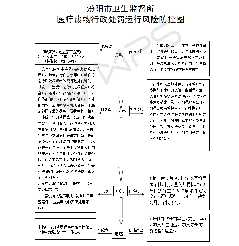 1、立案责任:发现违反医疗废物管理规定的违法行为或举报案件,予以审查、决定是否立案。 2、调查责任:执法科室及乡镇卫生监督站对各自辖区内立案的案件,指定专人负责,及时组织调查取证,与当事人有直接利害关系的应到回避。执法人员不得少于两人,调查时应出示执法证件,允许当事人辩解陈述。执法人员应保守有关秘密。 3、审查责任:审理案件调查报告,对案件违法事实、证据、调查取证程序、法律适用、处罚种类和幅度、当事人陈述和身边理由等方面进行审查,提出处理意见(主要证据不足时,以适当的方式补充调查)。 4、告知责任:作出行政处罚决定前,应制作《行政处罚告知书》送达当事人,告知违法事实及其享有的 陈述、申辩等权利。符合听证规定的,制作并送达《行政处罚听证告知书》。 5、决定责任:制作行政处罚决定书,载明行政处罚告知、当事人陈述申辩或者听证情况等内容。 6、送达责任:行政处罚决定书按法律规定的方式送达当事人 7、执行责任:依照生效的行政处罚决定,采取罚款、责令停业等行政处罚措施。 8、其他法律法规规章文件规定应履行的责任。 |