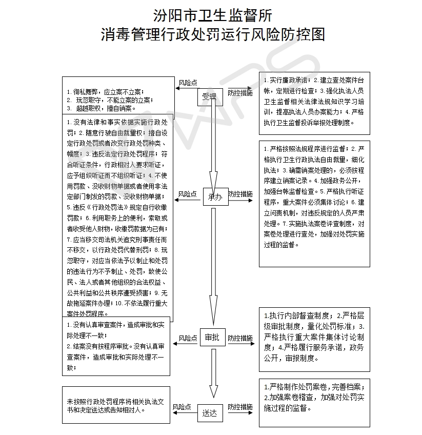 1、立案责任:发现违反消毒卫生监督管理规定的违法行为或举报案件,予以审查、决定是否立案。 2、调查责任:综合执法科室及乡镇卫生监督站对各自辖区内立案的案件,指定专人负责,及时组织调查取证,与当事人有直接利害关系的应到回避。执法人员不得少于两人,调查时应出示执法证件,允许当事人辩解陈述。执法人员应保守有关秘密。 3、审查责任:审理案件调查报告,对案件违法事实、证据、调查取证程序、法律适用、处罚种类和幅度、当事人陈述和身边理由等方面进行审查,提出处理意见(主要证据不足时,以适当的方式补充调查)。 4、告知责任:作出行政处罚决定前,应制作《行政处罚告知书》送达当事人,告知违法事实及其享有的 陈述、申辩等权利。符合听证规定的,制作并送达《行政处罚听证告知书》。 5、决定责任:制作行政处罚决定书,载明行政处罚告知、当事人陈述申辩或者听证情况等内容。 6、送达责任:行政处罚决定书按法律规定的方式送达当事人 7、执行责任:依照生效的行政处罚决定,采取罚款、责令停业等行政处罚措施。 8、其他法律法规规章文件规定应履行的责任。 |