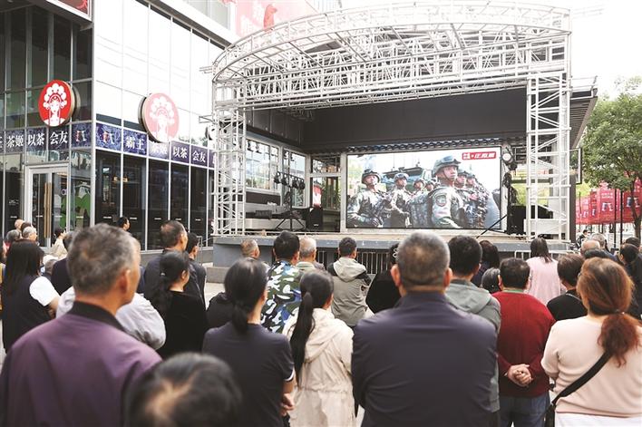 图⑤为市民在购物广场前观看直播。 记者 侯利军 摄