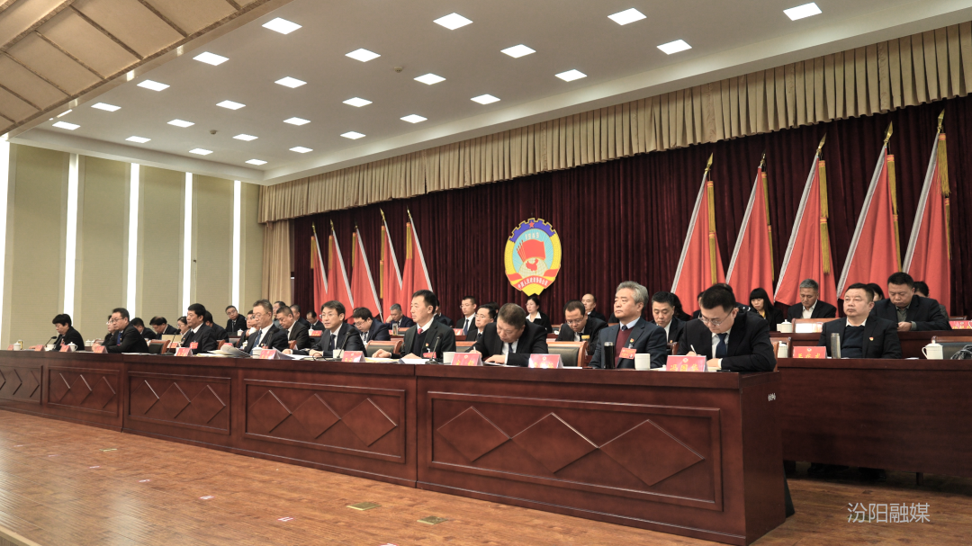 会场内气氛庄重、热烈,象征全国各族人民大团结的中国人民政治协商会议会徽悬挂在主席台正中,会场悬挂着“坚持以习近平新时代中国特色社会主义思想为指导,凝心聚力砥砺前行共谱美丽幸福汾阳新篇章”的横幅。