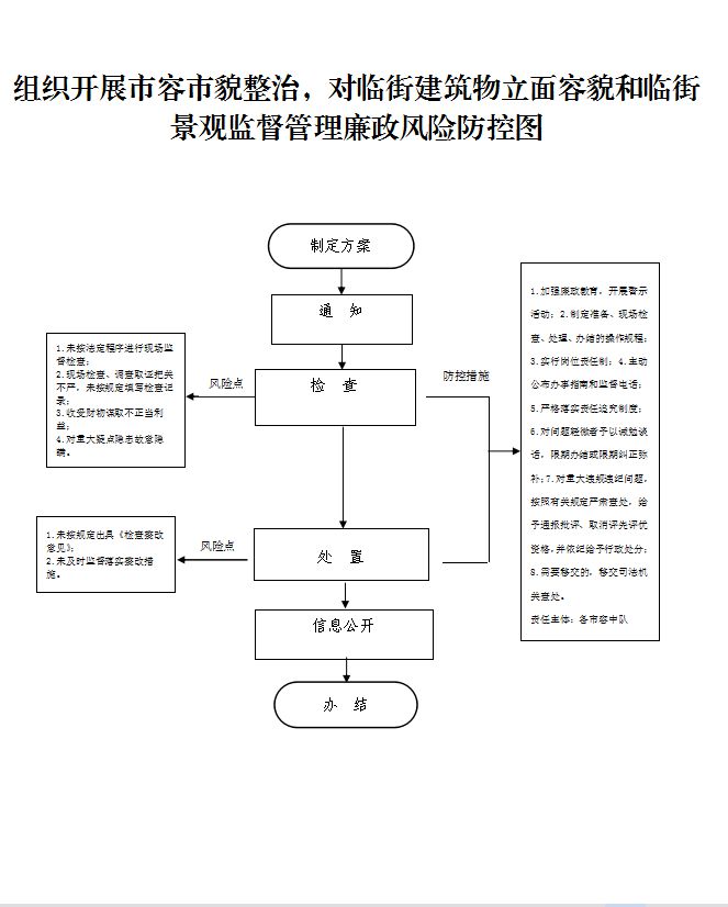 1.检查责任:对市容市貌进行现场检查; 2.处置责任:对违反市容环境卫生相关法律法规的行为依法处理; 3.信息公开责任:定期向社会公开公示检查情况。 4.其他法律法规规章规定应履行的责任。 |