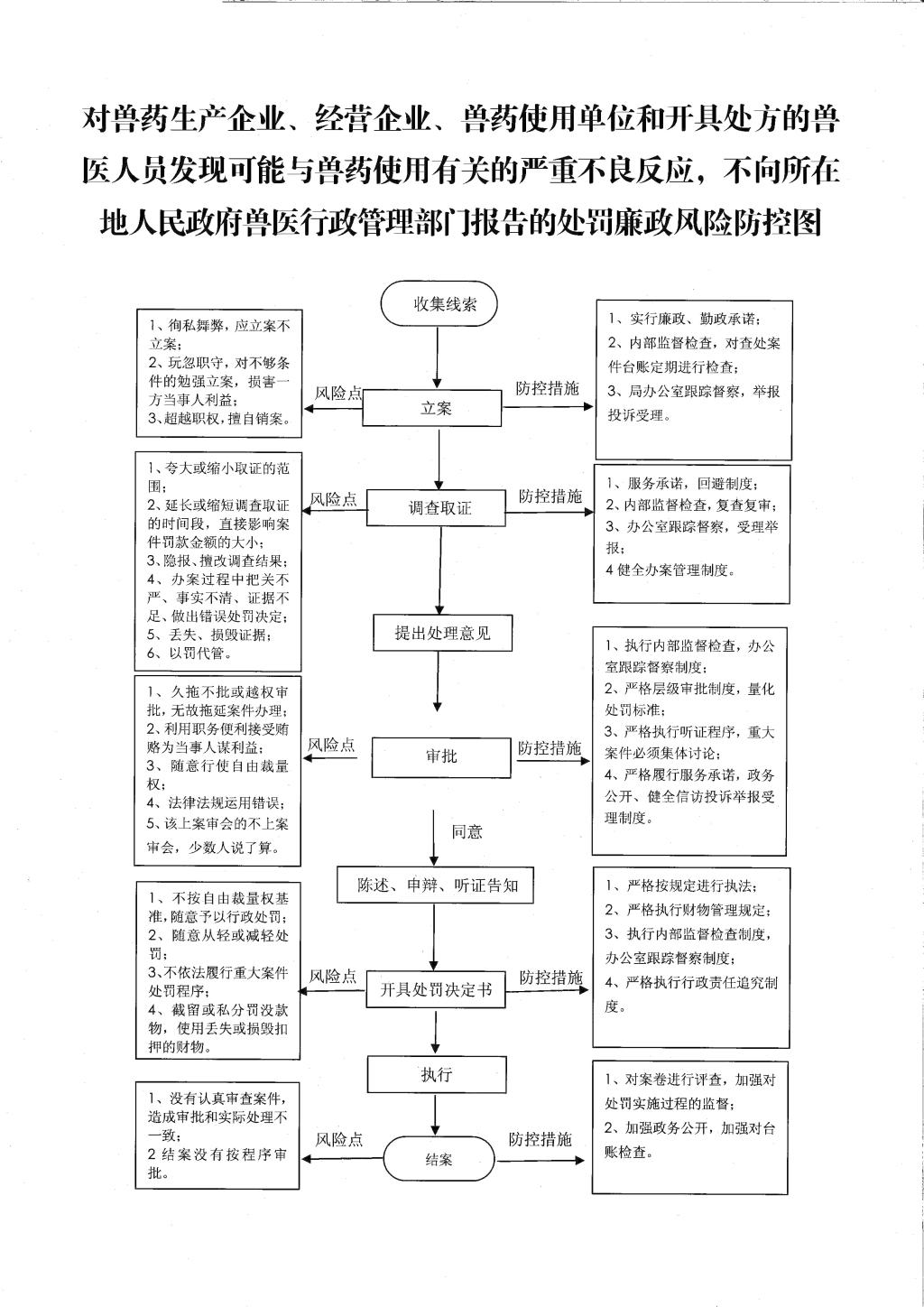 1、立案责任:发现兽药生产企业、经营企业、兽药使用单位和开具处方的兽医人员发现可能与兽药使用有关的严重不良反应,不向所在地人民政府兽医行政管理部门报告的违法行为,予以审查、决定是否立案。 2、调查责任: 对立案的案件,指定专人负责,及时组织调查取证,与当事人有直接利害关系的应到回避。执法人员不得少于两人,调查时应出示执法证件,允许当事人辩解陈述。执法人员应保守有关秘密。 3、审查责任:审理案件调查报告,对案件违法事实、证据、调查取证程序、法律适用、处罚种类和幅度、当事人陈述和身边理由等方面进行审查,提出处理意见(主要证据不足时,以适当的方式补充调查)。 4、告知责任:作出行政处罚决定前,应制作《行政处罚告知书》送达当事人,告知违法事实及其享有的 陈述、申辩等权利。符合听证规定的,制作并送达《行政处罚听证告知书》。 5、决定责任:制作行政处罚决定书,载明行政处罚告知、当事人陈述申辩或者听证情况等内容。 6、送达责任:行政处罚决定书按法律规定的方式送达当事人 7、执行责任:依照生效的行政处罚决定,进行处罚。 8、其他法律法规规章文件规定应履行的责任。 |