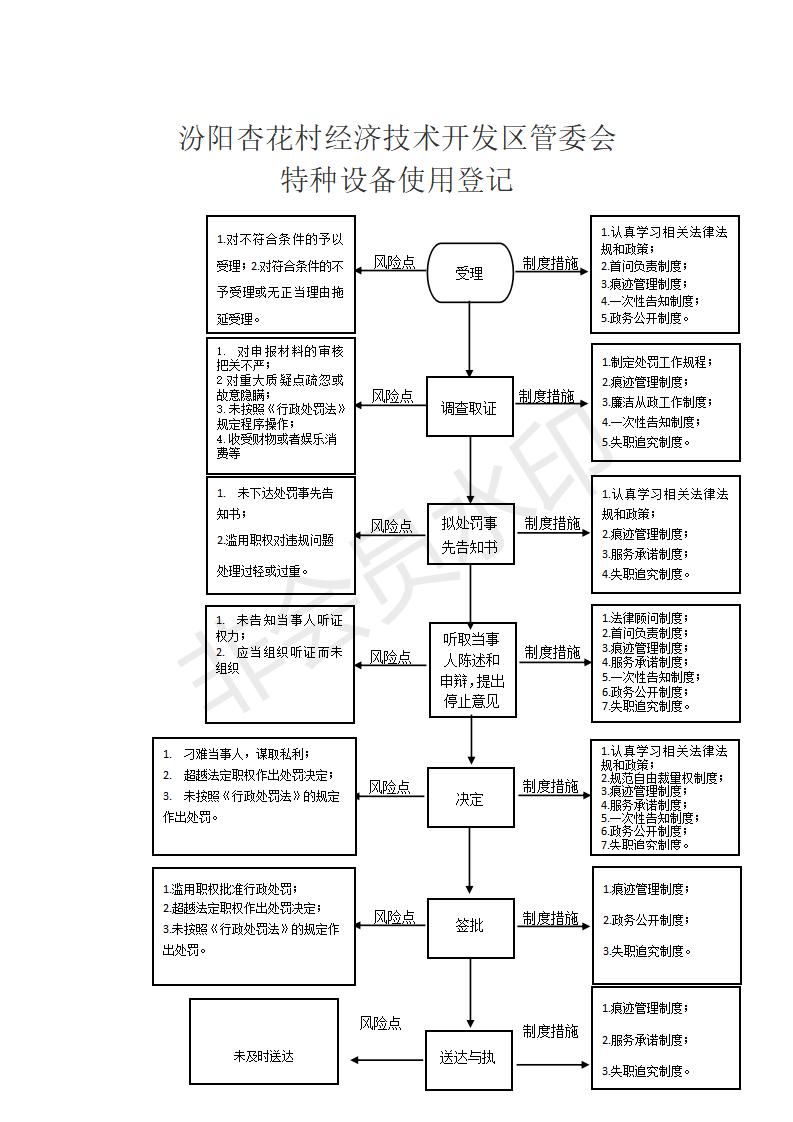 1.受理责任:公示特种设备使用登记应当提交的材料,一次性告知补正材料,依法受理或不予受理(不予受理应当告知理由)。 2.审查责任:按照法律、法规规定的条件和标准,对特种设备使用登记书面申请材料进行审核,组织现场勘察。3.决定责任;作出行政许可或者不予行政许可决定,法定告知(不予许可的应当书面告知理由) 4.送达责任:准予许可的,核发许可证书,送达并信息公开。 5.事后监管责任:建立实施监督检查的运行机制和管理制度,开展定期和不定期检查,依法采取相关处置措施。 6.其他责任:法律法规规章规定应履行的责任。 |