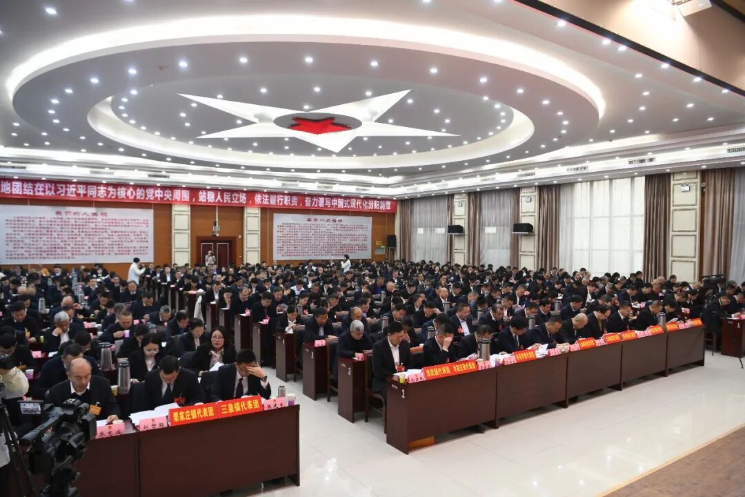 会场内气氛庄重热烈。大会主席台正中央中华人民共和国国徽在鲜艳的红旗映衬下熠熠生辉。会场内“更加紧密地团结在以习近平同志为核心的党中央周围,站稳人民立场,依法履行职责,奋力谱写中国式现代化汾阳篇章”的标语振奋人心、催人奋进。